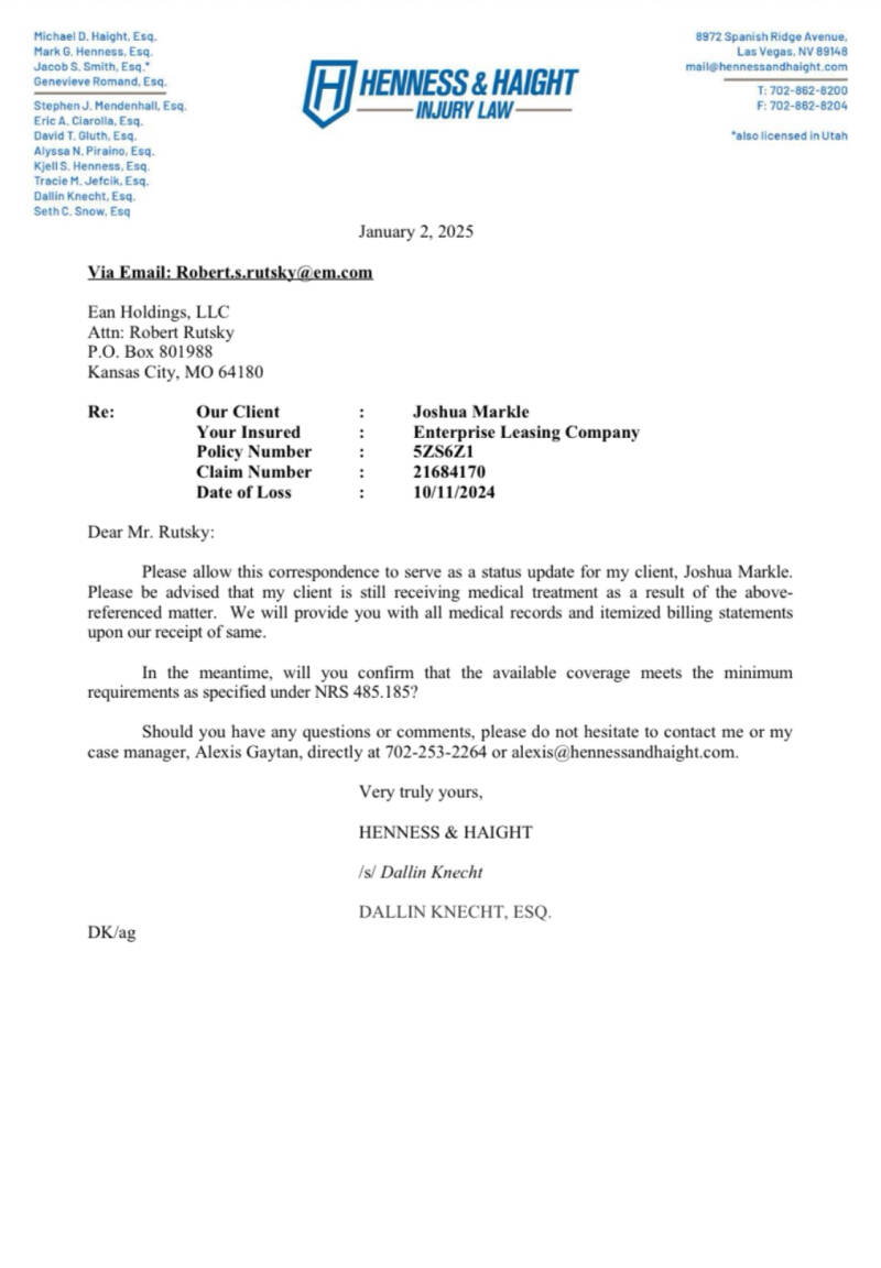 • The Description: Over a year after the wreck, the firm's "professionalism" is on full display: they misidentified the date of the accident as "October 10, 2024" despite every other document stating October 11. This letter also admits they chose not to preserve the vehicle and confirms they breached privacy by putting a spouse's insurance card in the wrong email as the "Full Client File."